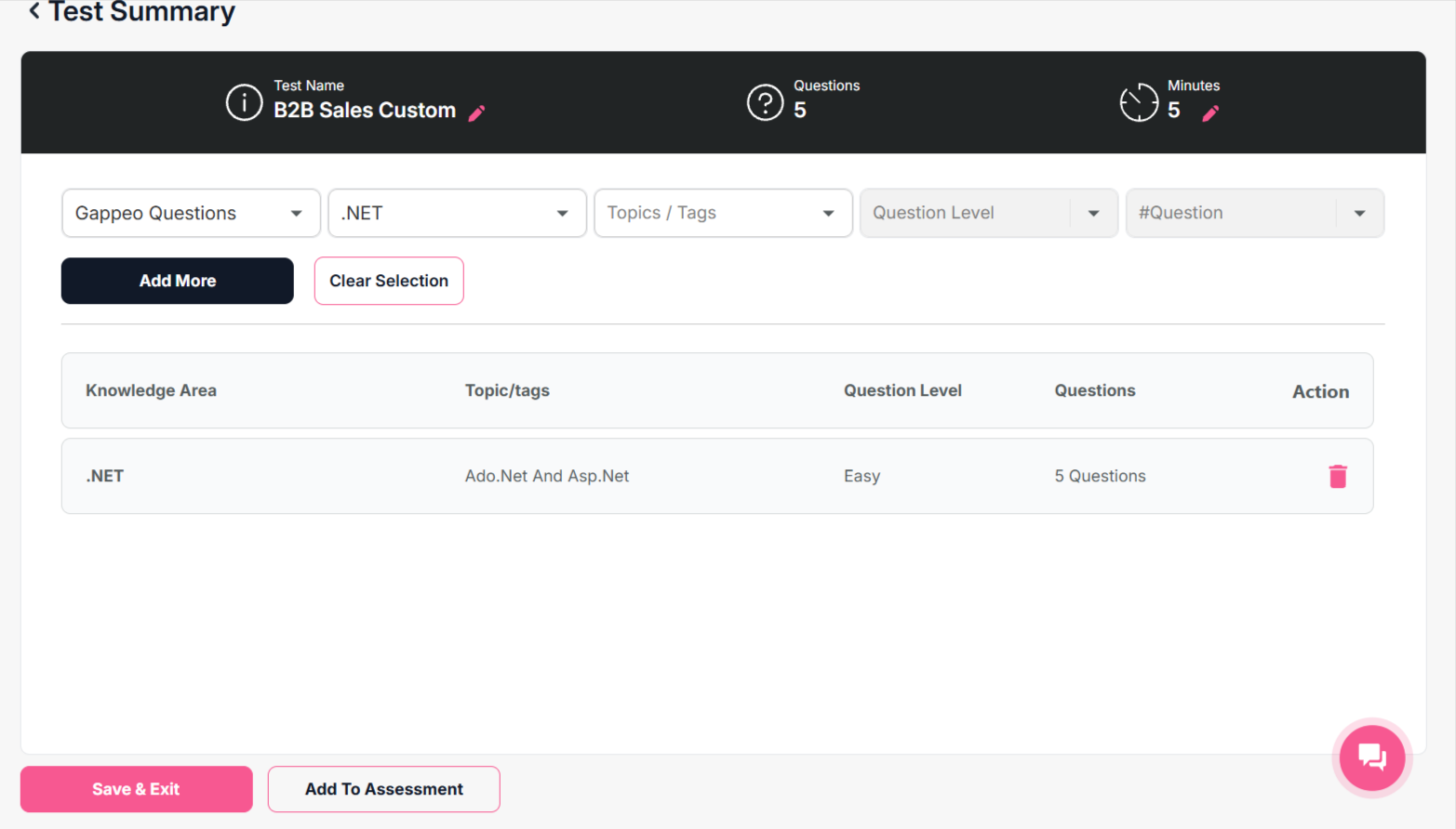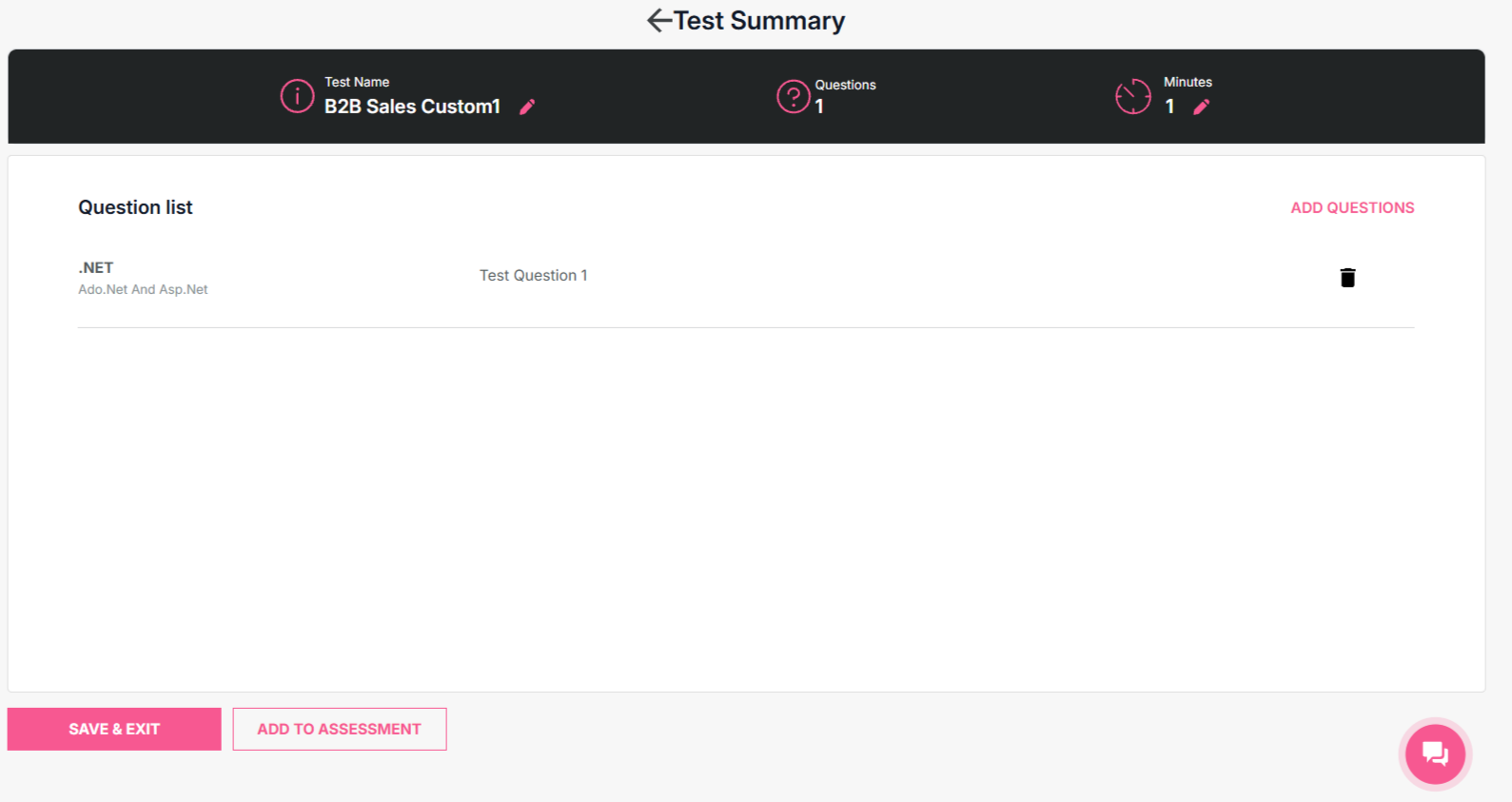 - Once done, you will get an option to save the test and exit. Also you can directly add the test to the assessment by clicking on Add to assessment button.