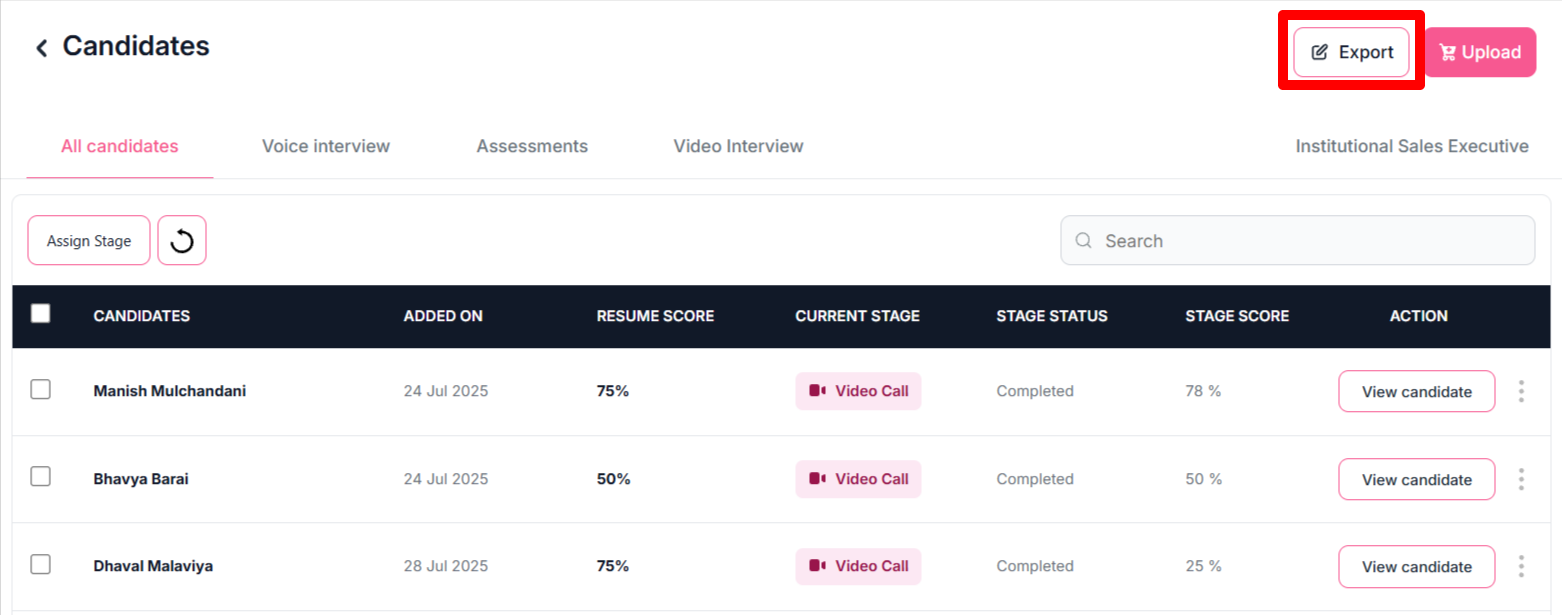 - Once you click on that button, it will export a CSV file containing the list of all candidates along with their resume scores and respective stage scores.